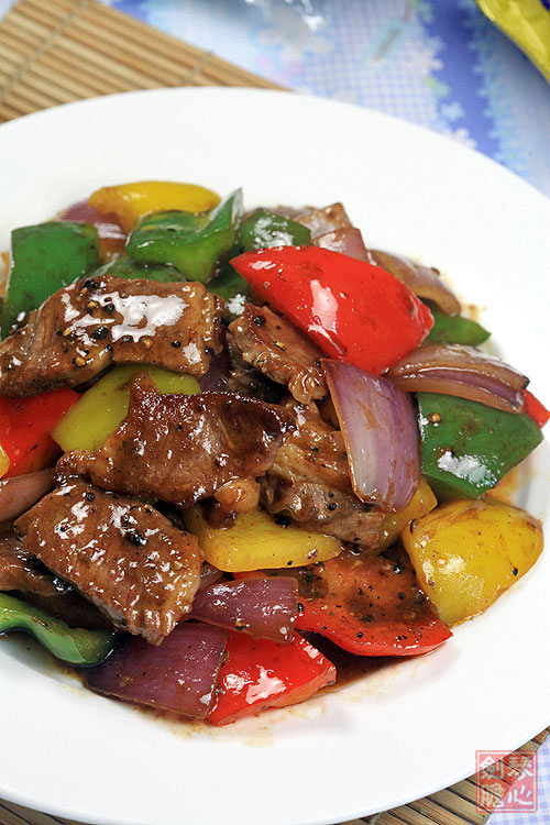 黑椒和牛肉,很般配的一个组合,西餐里常用。不过,粤菜很善于吸收利用这些外来食材,利用自己的烹调方法,中外结合,创造出适合自己口味的美味佳肴。西冷牛肉含一定肥油,由于是牛外脊,在肉的外延带一圈呈白色的肉筋,而且肉质里面含有适量的脂肪,口感要比里脊肉好,很喜欢那种质感。用黑椒汁,甜椒和洋葱炒西冷牛肉,味道,口感都相当不错,现在很多粤菜馆都有类似的菜出品。