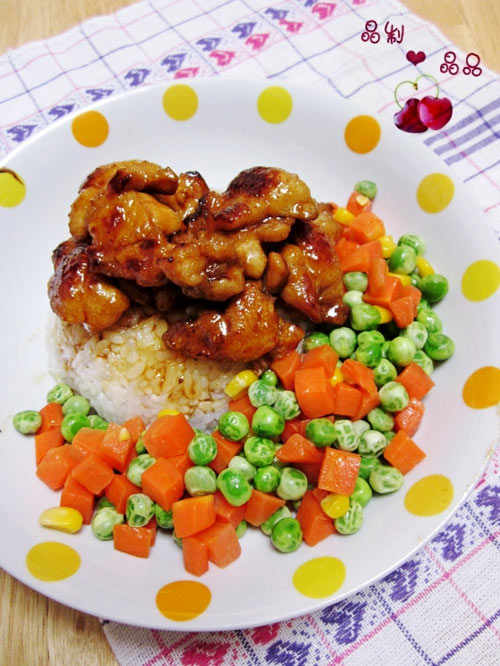 及以下步骤:炒锅内放油少许,加入鸡肉,小火煎熟。 煎至两面都有微微的焦黄色。 将剩余的调味酱汁混合在一起,成照烧酱。 将酱汁倒入锅中,加入等量的清水,小火慢烧。 五分钟后,开大火收汁。 将米饭盛入盘中。 周围摆上炒熟的三色蔬菜。 关火,将鸡肉摆到米饭上,淋入剩余的汤汁即可。 周围摆上炒熟的三色蔬菜。 关火,将鸡肉摆到米饭上,淋入剩余的汤汁即可。