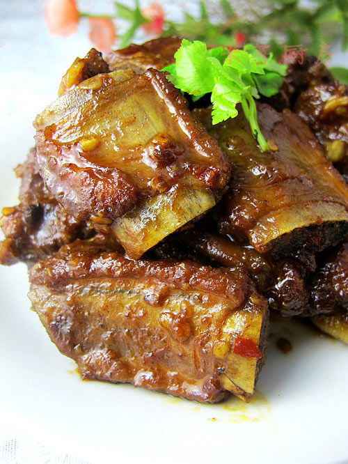 这款排骨是米芽在一农家烧菜馆吃到的。稍有不同的是,农家菜里用的是筒子骨,吃起来要戴手套,还配了吸管方便吸骨髓的。当时我问了小老板,这道菜怎么做的,他只是神秘的说,其实非常简单,主要是里面的蒜蓉辣酱,是他们店里秘制的。我回来用李锦记的蒜蓉辣酱做了,也没有再多加什么别的调料了,感觉味道跟小店里吃的也没有太大区别,小窃喜了一下……