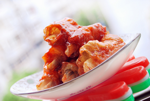 糖醋排骨色泽红亮油润,口味香脆酸甜,不少人都喜欢。有一道糖醋素排骨也许你也会喜欢。此菜系将油条切成段,再串入莲藕条,油炸后,再以番茄沙司烹制而成。成菜后,形状酷似排骨,色泽红艳油亮,口味香脆甜酸。