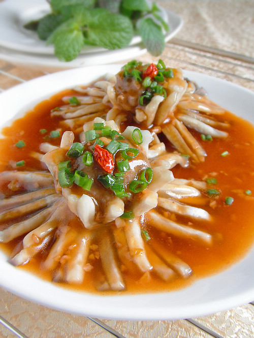 包裹着肉末蒸好的茄子,伴着扑鼻的蒜香,吃的时候把茄花按碎,裹上香味浓郁、酸甜可口的汤汁,既鲜嫩又爽滑。