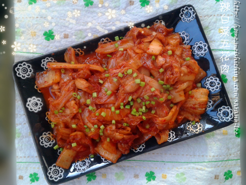 辣白菜五花肉(배추김치삼겹살볶음),是很家常的一道菜,做法简便,味道酸辣微甜,食欲不振的时候吃,很开胃~另外还解决了家里剩下的过酸辣白菜的问题^^~真是一举两得啊!