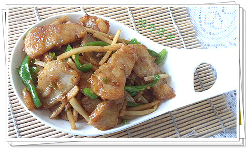及以下步骤:将脆笋丝和青椒丝过油。 葱姜炝锅,烹入料酒,生抽,放入鳕鱼片,翻炒。 放入脆笋丝和青椒丝,放盐,少许白糖,味精。 翻炒均匀即可。 看看成品吧 将脆笋丝和青椒丝过油。 葱姜炝锅,烹入料酒,生抽,放入鳕鱼片,翻炒。 放入脆笋丝和青椒丝,放盐,少许白糖,味精。 翻炒均匀即可。 看看成品吧