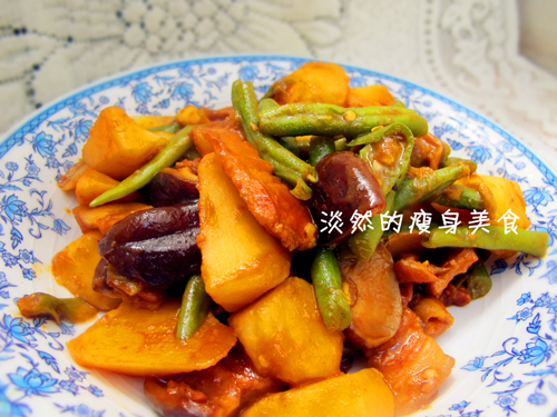 【淡然的享瘦主义:改变吃饭顺序也能减肥!】 吃饭顺序也是一门学问哦!当你吃饭的时候,先吃什么,后吃什么,也会对体重有非常大的营养。遵循以下饮食原则,就能够轻松享瘦。 首先,吃饭前先为自己准备一个巴掌大小的盘子,往盘子里面夹满各种颜色的蔬果,试 着先把盘子里的蔬果吃完,再去吃米饭和肉类等,当然,不必过于严苛遵守,这样做的目的只是为了提醒自己蔬果优先摄取的原则。如此一来,高纤维、低热量的食物已经占据了大部分的胃部空间,高热量、高油脂的自然就吃的少了,若习惯这样的饮食顺序,你会慢慢发现自己身材和健康的改善! 今天,为大家推荐的是一道荤素相宜的土豆豆角烧香菇,可以满足不同需求的胃口哦! 【土豆豆角烧香菇】 时间:25分钟 热量:347大卡 (100g香菇-19大卡;100g土豆-168大卡;100g豆角-30大卡;100g猪肉-143大卡) 分享:两人份