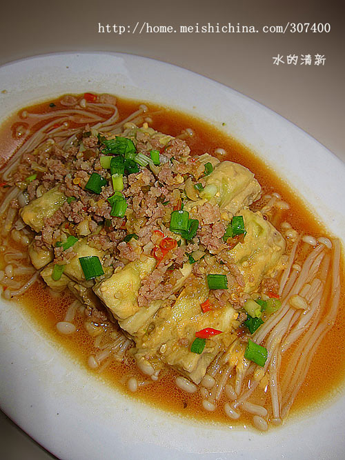 及以下步骤:另起锅放油烧热,入蒜爆香。 关小火,入肉末翻炒。 加入辣椒、100ml水,盐、老抽,3克冰糖煮开。 入味精再煮1分钟后将汁淋在茄子上即可。 取盘子,金针菇铺在盘底,上面放上裹好咸蛋黄的茄子后放在蒸锅内隔水大火蒸5-8分钟取出。 在蒸好的菜上撒上葱花。 另起锅放油烧热,入蒜爆香。 关小火,入肉末翻炒。 加入辣椒、100ml水,盐、老抽,3克冰糖煮开。 入味精再煮1分钟后将汁淋在茄子上即可。