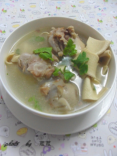 及以下步骤:然后把豆腐皮放入继续炖10分钟左右。 最后再加入少许盐和香菜即可。(不喜欢香菜可以换成葱花) 很清淡的鲜汤,老少皆宜! 筒骨用清水冲洗干净血沫。 豆腐皮洗净后切成条状,然后打成结。(如图) 冲洗干净的放入锅内,在加入姜片,蒜片,少许香醋,和料酒。 盖上盖慢炖1小时。(具体时间视筒骨的量而定) 然后把豆腐皮放入继续炖10分钟左右。 最后再加入少许盐和香菜即可。(不喜欢香菜可以换成葱花) 很清淡的鲜汤,老少皆宜!