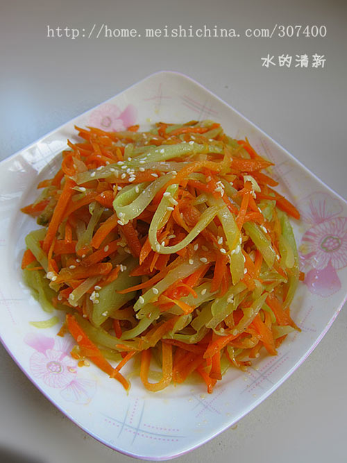 此菜口感很清爽,略带点甜味。萝卜、莴笋搭配起来健脾的功效比较强,是冬天的必备养生菜啊。 莴笋的营养及功效: 1. 开通疏利、消积下气:莴苣味道清新且略带苦味,可刺激消化酶分泌,增进食欲。其乳状浆液,可增强胃液、消化腺的分泌和胆汁的分泌,从而促进各消化器官的功能,对消化功能减弱、消化道中酸性降低和便秘的病人尤其有利。 2. 利尿通乳:莴苣钾含量大大高于钠含量,有利于体内的水电解质平衡,促进排尿和乳汁的分泌。对高血压、水肿、心脏病人有一定的食疗作用。 3. 强壮机体、防癌抗癌:莴苣含有多种维生素和矿物质,具有调节神经系统功能的作用,其所含有机化含物中富含人体可吸收的铁元素,对有缺铁性贫血病人十分有利。莴苣的热水提取物对某些癌细胞有很高的抑制率,故又可用来防癌抗癌。 4. 宽肠通便:莴苣含有大量植物纤维素,能促进肠壁蠕动,通利消化道,帮助大便排泄,可用于治疗各种便秘。 5.莴笋含钾量较高,有利于促进排尿,减少对心房的压力,对高血压和心脏病患者极为有益。含有少量的碘元素,它对人的基础代谢,心智和体格发育甚至情绪调划都有重大影响。因此莴笋具有镇静作用,经常食用有助于消除紧张,帮助睡眠。不同于一般蔬菜的是它含有非常丰富的氟元素,可参与牙和骨的生长。能改善消化系统和肝脏功能。刺激消化液的分泌,促进食欲,有助于抵御风湿性疾病和痛风。 胡萝卜的功效: 胡萝卜性温 味甘,性平。 成分 本品含蛋白质、脂肪、糖类、胡萝卜素、维生素c及矿物质、挥发油等。有健脾消食、补肝明目、清热解毒、透疹、降气止咳等功效。可用于小儿营养不良、麻疹、夜盲症、便秘、高血压、肠胃不适、饱闷气胀等。 功效详细说明: 1、益肝明目-胡萝卜含有大量胡萝卜素,这种胡萝卜素的分子结构相当于2个分子的维生素a,进入机体后,在肝脏及小肠粘膜内经过酶的作用,其中50%变成维生素a,有补肝明目的作用,可治疗夜盲症; 2、利膈宽肠-胡萝卜含有植物纤维,吸水性强,在肠道中体积容易膨胀,是肠道中的充盈物质,可加强肠道的蠕动,从而利膈宽肠,通便防癌; 3、健脾除疳-维生素a是骨骼正常生长发育的必需物质,有助于细胞增殖与生长,是机体生长的要素,对促进婴幼儿的生长发育具有重要意义; 4、增强免疫功能-胡萝卜素转变成维生素a,有助于增强机体的免疫轼能,在预防上皮细胞癌变的过程中具有重要作用。胡萝卜中的木质素也能提高机体免疫机制,间接消灭癌细胞; 5、 降糖降脂-胡萝卜还含有降糖物质,是糖尿病人的良好食品,其所含的某些成分,如懈皮素、山标酚能增加冠状动脉血流量,降低血脂,促进肾上腺素的合成,还有降压,强心作用,是高血压、冠心病患者的食疗佳品。 胡萝卜在西方有很高的声誉,被视为菜中上品。荷兰人把它列为国菜之一。胡萝卜所含的营养素很全面。据测定,每百克含碳水化合物7.6克,蛋白质0.6克,脂肪0.3克,钙30毫克,铁0.6毫克,以及维生素b1、维生素b2、维生素c等,特别是胡萝卜素的含量在蔬菜中名列前茅,每百克中约含胡萝卜素3.62毫克,相当于1981国际单位的维生素a,而且于高温下也保持不变,并易于被人体吸收。胡萝卜素有维护上皮细胞的正常功能、防治呼吸道感染、促进人体生长发育及参与视紫红质合成等重要功效。 6、胡萝卜是一种带根皮的蔬菜。据国外报道,常食带根皮的蔬菜,可以强壮身体,御寒耐冷。日本学者认为,带根皮的蔬菜生长在土壤里,根部和皮壳中含有大量的无机盐和营养素。近年来,国内外资料均报道,胡萝卜具有突出的防癌抗癌作用。研究发现,缺乏维生素a的人,癌症发病率比正常人高2倍多。每天如能吃一定量的胡萝卜,对预防癌症大有益处。因为胡萝卜中所富含的胡萝卜素能转变成大量的维生素a,因此,可以有效地预防肺癌的发生,甚至对已转化的癌细胞也有阻止其进展或使其逆转的作用。研究还发现,胡萝卜中含有较丰富的叶酸,为一种b族维生素,也具有抗癌作用;胡萝卜中的木质素,也有提高机体抗癌的免疫力和间接杀灭癌细胞的功能。对长期吸烟的人,每日如能饮半杯胡萝卜汁,对肺部也有保护作用。 7、胡萝卜素因属脂溶性物质,故只有在油脂中才能被很好地吸收。因此,食用胡萝卜时最好用油类烹调后食用,或同肉类同煨,以保证有效成分被人体吸收利用。