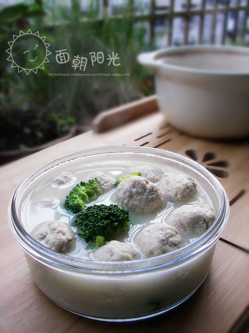 及以下步骤:用两个瓢羹来回翻倒,将拌好的豆腐泥和肉泥做成丸子。 炖好的鲫鱼汤取出里面的鱼、姜蒜、萝卜片。 将鱼汤过滤一下,以免有刺,此时的汤像牛奶一样。 将砂锅重置火上,待鱼汤再次翻滚,下做好的丸子。 加入西兰花稍煮。 待丸子煮至浮起,调入少量盐。 将鱼汤过滤一下,以免有刺,此时的汤像牛奶一样。 将砂锅重置火上,待鱼汤再次翻滚,下做好的丸子。 加入西兰花稍煮。 待丸子煮至浮起,调入少量盐。