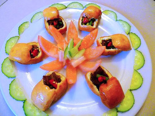 及以下步骤:小馒头控干油后,从上部大约四分之一处用刀开口切开。 将馒头里面多余的馒头挖出,切忌用力,形成箱子形状。 将五花肉蒜苗分别装在馒头箱子内,摆盘即可。 将五花肉片放入锅中翻炒。 肉片炒至金黄色后加入葱花,豆豉辣酱。 将蒜苗倒入锅中继续翻炒,加入盐,鸡精炒熟。 另起一只锅放油,五成热时改小火下入小馒头炸至金黄色捞出。 小馒头控干油后,从上部大约四分之一处用刀开口切开。 将馒头里面多余的馒头挖出,切忌用力,形成箱子形状。 将五花肉蒜苗分别装在馒头箱子内,摆盘即可。