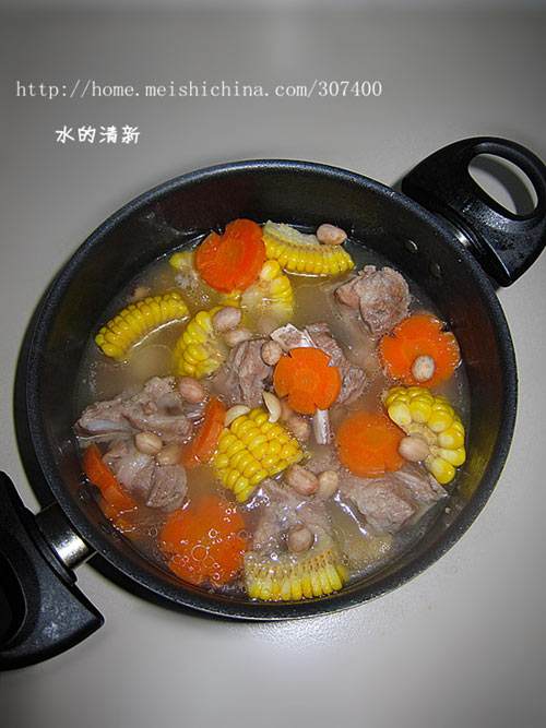 及以下步骤:猪排洗净切断。萝卜切成厚2cm的花形(我以前的日志有详细方法)。 准备好所需原料。 猪排洗净切断。萝卜切成厚2cm的花形(我以前的日志有详细方法)。 准备好所需原料。 猪排洗净切断。萝卜切成厚2cm的花形(我以前的日志有详细方法)。 准备好所需原料。 猪排洗净切断。萝卜切成厚2cm的花形(我以前的日志有详细方法)。 玉米洗净,切成块。花生洗净。 排骨放炖锅内,加水煮开,去除干净上面的浮沫后加入花生大火煮开后小火炖50分钟。 加入萝卜玉米小火继续炖5-8分钟后入盐调味即可。