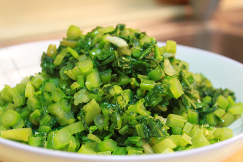 7、用冷水稍微洗一下,沥干水份,切碎,切少许蒜粒。