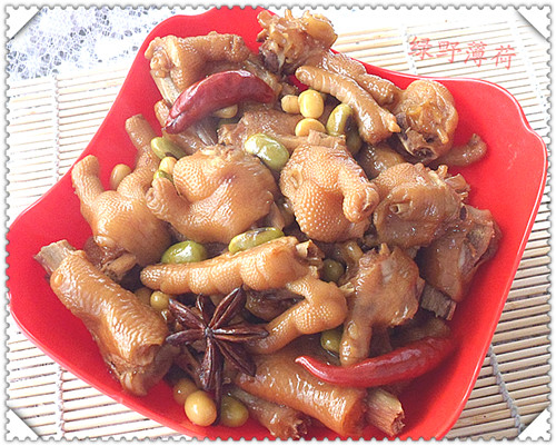 及以下步骤:看看成品吧 看看原料吧 鸡爪剁成小块,泡在清水里2小时去除异味。 看看原料吧 鸡爪剁成小块,泡在清水里2小时去除异味。 泡好的鸡爪放冷水锅焯一下备用。 锅中放焯好的鸡爪,黄豆,青豆,料酒,酱油,耗油,白糖,大料,桂皮,香叶,干红椒。放水,没过鸡爪。 用大火煮开,改小火炖制30分钟。 收干汤汁,放少许盐即可。 看看成品吧