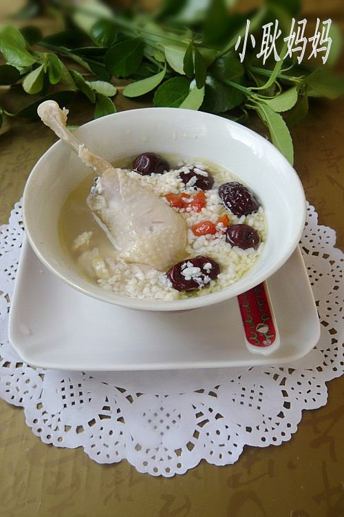 6、加上酒酿,枸杞和红枣烧开就可以。