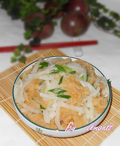 及以下步骤:放入萝卜和浮皮炒片刻。 倒入少许的水焖煮至萝卜软身。 放盐,鸡精和葱花炒匀即可。 简单的美味。 葱切段。 热油锅,把姜爆香。 放入萝卜和浮皮炒片刻。 倒入少许的水焖煮至萝卜软身。 放盐,鸡精和葱花炒匀即可。 简单的美味。