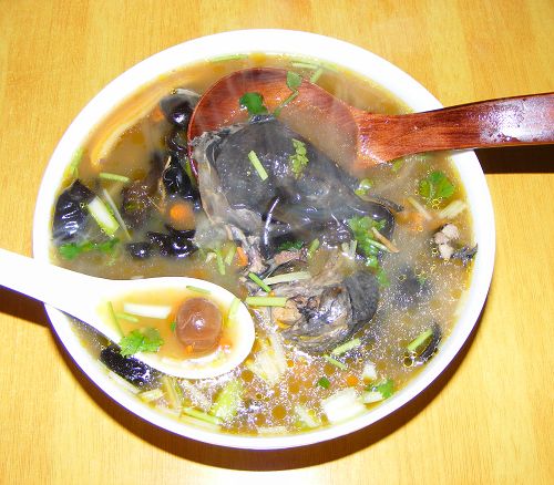 6、煲了1小时30分,鸡肉已经软烂脱骨。盛到大烫碗里,放了点盐、撒上香菜末和葱末,开喝了!~