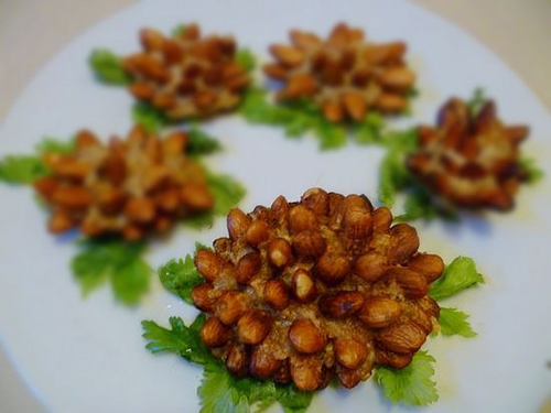 4、将美国大杏仁一层一层镶嵌在上面形成花朵形。
