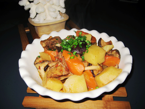 盐(适量) / 白糖(适量) / 胡萝卜(适量) / 食用油(适量) / 八角(适量) / 老抽(适量) / 香菇(适量) / 土豆(适量) / 大蒜(适量) / 老姜(适量) / 山奈(适量) / 豆瓣(适量)