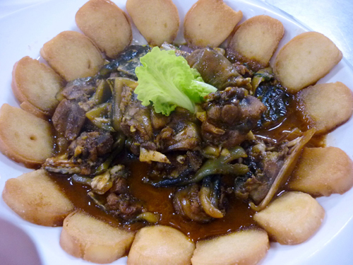 5、大火收汁,加鸡精和胡椒粉调味出锅,馒头片炸好围边。