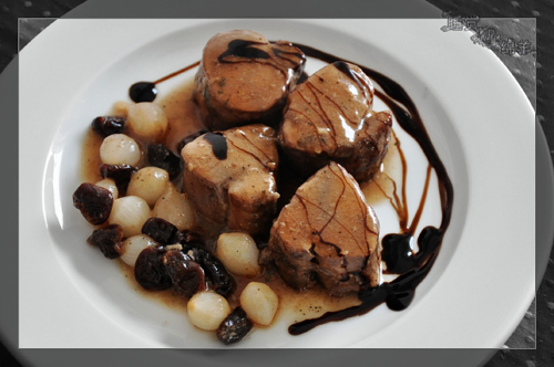 及以下步骤:将腌料倒入锅里,加入蔬菜汤,煮开。 将煮好的汁过筛,再倒入锅里。加入干樱桃和醋腌小洋葱头,再次煮开。 最后将肉放入汁里一起煮一会,加入淀粉勾芡,装盘后淋上写balsamico,即可。 煮开后,小火煮3分钟。关火,等凉。 将里脊条放入一个冷藏袋里,倒入凉了的腌料,扎上口,放入冰箱腌一天。 将里脊条拿出,切成近2cm的块。 锅里给油烧热,撒入芜荽,下里脊块,煎到变色。然后用锡纸包起来,放入烤箱烤15分钟,保证里脊熟透即可。 将腌料倒入锅里,加入蔬菜汤,煮开。 将煮好的汁过筛,再倒入锅里。加入干樱桃和醋腌小洋葱头,再次煮开。 最后将肉放入汁里一起煮一会,加入淀粉勾芡,装盘后淋上写balsamico,即可。