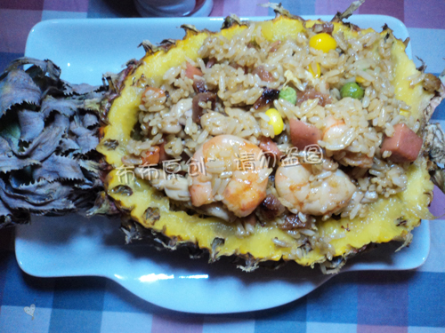 好久之前就买了个菠萝,买的时候也没想过拿来干嘛什么的,反正看见就败了~ 我这人就这坏毛病,不过还好,每次都没浪费!最后关头,还是能用! 哈哈 前几天,和姐妹们到我们这边新开的一家泰国菜馆吃饭。发现了一道美食挺不错的! 以前在深圳吃过,但是已经忘记什么味道了,这次能够重温!感觉很好。 现在,我看着这桌上的菠萝,心里痒痒了。于是就有了这个菠萝炒饭!!! 哈哈,大家肯定郁闷了,不是说泰国菜吗?干嘛题目是中式的菠萝炒饭啊! 原因有两点了......第一点还挺不好意思说,因为这菠萝留太久了,果肉部分坏掉了,最后只能做个装饰,炒的时候,就没有香香甜甜地菠萝粒了!!哎!!都怪我! 这第二嘛!!因为我家的那位怪人不吃咖喱!! 这东南亚的菜,不都放咖喱嘛!!没办法,他是皇帝!放了肯定不吃。。。。。 好吧,看看俺的做法! 你也可以试试的噢!
