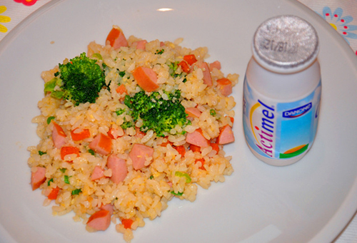 鸡蛋(2个) / 西兰花(50克) / 胡萝卜(50克) / 葱(少量) / 火腿肠(50克) / 饭(1碗)
