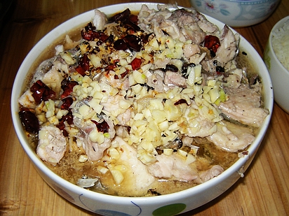 及以下步骤:锅中留油,炒白菜至断生。 白菜铺到盆底。 锅中再下油炒香蒜末姜片和豆豉。 锅中下鸡汤,加盐,烧开。 下鱼片大火煮5分钟。 将鱼片和汤都倒在白菜碗里,上面放蒜末和辣椒花椒碎。 锅中热油,烧冒烟。 将油倒在蒜末和辣椒花椒碎上。 锅中热油,烧冒烟。 将油倒在蒜末和辣椒花椒碎上。