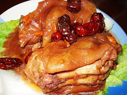 说起猪蹄,老广第一时间就会想起那碗冒着特殊香气的红彤彤的猪脚姜来,一大锅里慢慢煨着,但凡想要补血强体的人,都可以热腾腾地来上一碗,吃下去浑身都舒服。 猪蹄是我国南北方人民都喜爱的食品。由于猪蹄中含有丰富的胶原蛋白,脂肪含量也比肥肉低,长期食用能明显增强皮肤弹性,让人更年轻,因而民间有种说法——冬吃猪蹄赛熊掌。 说起猪蹄的食疗作用,不禁想起《金婚》里面,演到文丽怀孕时,邻居庄嫂特地为她做了一碗猪蹄,文丽两手齐上,吃得一脸馋相,满足得不得了。可见猪蹄是孕妇补身的佳品。传统医学认为,猪蹄有壮腰补膝和通乳之功,即便对普通女性来说,多吃猪蹄也可丰胸,对中老年妇女,常食猪蹄还能缓解骨质疏松。 猪蹄一般可用来卤、扒、红烧,制作猪脚姜,或煲黄豆汤、花生汤等,做法简单。而挑选生猪蹄,首要是看蹄的颜色,尽量买接近肉色的,过白、发黑的不要买;此外,最好用鼻子闻一下——经化学处理或腐烂变质的,会有一股刺激性味道;最后,最好挑选有筋的猪蹄,所含的胶原蛋白更多,吃起来也更香。