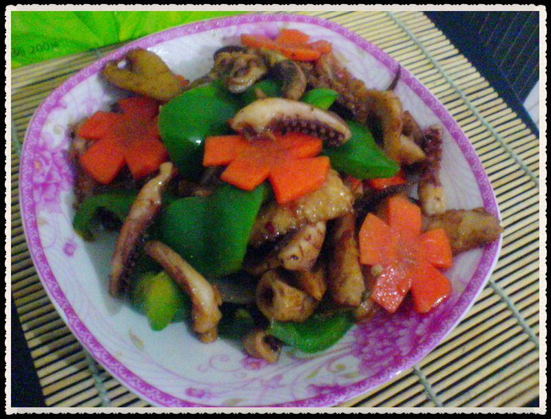 6、最后加入甜椒,胡萝卜花,鸡精,翻炒,就可盛出了,喜欢吃老点的,可再炒会,(忘记拍加菜的图片了,亲们,凑合看吧)。