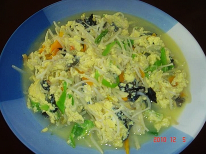 及以下步骤:鸡蛋打成蛋液,加盐、料酒、一点点糖和白醋。 把豆芽和金针菇入蛋液搅匀。 鸡蛋打成蛋液,加盐、料酒、一点点糖和白醋。 把豆芽和金针菇入蛋液搅匀。 鸡蛋打成蛋液,加盐、料酒、一点点糖和白醋。 把豆芽和金针菇入蛋液搅匀。 木耳、南瓜、青椒切丝。 葱爆锅,先炒青椒、南瓜和木耳,炒出青椒香。 将鸡蛋液等入锅。 炒至鸡蛋液凝固,加盐出锅。