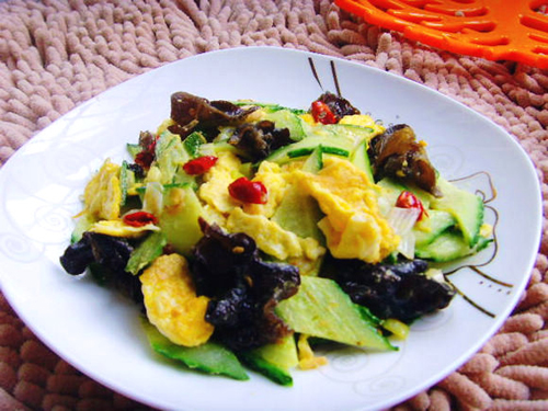 及以下步骤:锅内热油,爆香葱花、干辣椒。 倒入黄瓜片翻炒。 倒入木耳炒匀。 最后倒入炒好的鸡蛋,加盐调味即可。 葱切葱花。 干辣椒切小段。 锅内热油,爆香葱花、干辣椒。 倒入黄瓜片翻炒。 倒入木耳炒匀。 最后倒入炒好的鸡蛋,加盐调味即可。