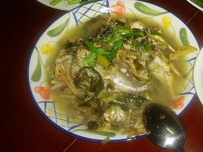 4、加点雪菜和泡椒,炖至汤汁浓稠。