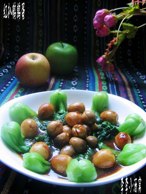 及以下步骤:鹌鹑蛋放入锅中煎一下,倒入碗汁。 最后下入草菇烧煮一下即可。 摆盘上桌。 锅中放入盐和油,加入适量水,水开放入青菜炒一下捞出摆盘。 鹌鹑蛋放入酱油腌制一下,扑上淀粉。 碗中加入酱油、白糖、高汤和香油做成碗汁。 草菇放入开水锅中焯30分钟,捞出。 鹌鹑蛋放入锅中煎一下,倒入碗汁。 最后下入草菇烧煮一下即可。 摆盘上桌。