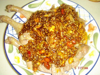 鸡的肉质细嫩,滋味鲜美,适合多种烹调方法,并富有营养,有滋补养身的作用。鸡肉不但适于热炒、炖汤,而且是比较适合冷食凉拌的肉类 鸡肉蛋白质的含量比例较高,种类多,而且消化率高,很容易被人体吸收利用 鸡肉,有增强体力、强壮身体的作用。另外含有对人体生发育有重要作用的磷脂类,是中国人膳食结构中脂肪和磷脂的重要来源之一。 鸡肉对营养不良、畏寒怕冷、乏力疲劳、月经不调、贫血、虚弱等有很好的食疗作用。祖国医学认为,鸡肉有温中益气、补虚填精、健脾胃、活血脉、强筋骨的功效。 吃鸡,向来被认为是预防感冒的妙方之一,特别是在秋冬流感盛行的季节。 蒸鸡腿鸡肉鲜美,配上辣辣的卤汁,很开胃。