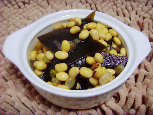 此菜味道咸鲜,营养丰富 黄豆不但蛋白质含量高,并含有多种人体不能合成而又必需的氨基酸 胆固醇含量中豆腐的蛋白质消化率高达95%,为理想的补益食疗之品 海带的营养价值很高 富含蛋白质、脂肪、碳水化合物、膳食纤维、钙、磷、铁、胡萝卜素、维生素以及碘等多种微量元素 中医认为,海带性味咸寒、无毒 具有软坚散结、消痰平喘、通行利水、祛脂降压等功效 可治痈肿、宿食不消、小便不畅、咳喘、水肿、高血压等症