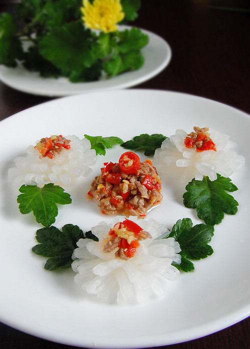 及以下步骤:用小刀切出均匀的花边,2个折边处不切断。 小心的切完整条。 从一端卷起。 一直卷到头,成为一朵菊花。 依次卷好需要的量,放入盘中。并在每朵花上面均匀的撒上少许食盐和白糖。 放入开水锅中蒸3分钟。 此时来准备配料。把牛肉洗净切成肉末,葱白和生姜也切成细末。 锅中热油,放入葱白末和姜末煸香。 加入牛肉末,滑炒至松散、变色。 把炒好的剁椒牛肉铺在白萝卜上即可。(上桌前用菊花叶装饰成白菊花)