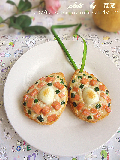 及以下步骤:在馒头片上均匀地抹上肉末。 中间位置按上鹌鹑蛋,火腿肠粒,韭菜。(如图) 锅内倒油加热后,把做好的馒头片放入炸。炸好一面后再翻面炸鸡肉那一面,等到馒头片变金黄即可捞出控油。 在炸好的图案上面用筷子插一个洞,再把韭菜塞入做为项链。 这张是用反色的特效来制作的照片。(看不清的话可进入我的日志查看) 这张是用阿宝色的特效来制作的照片。 锅内倒油加热后,把做好的馒头片放入炸。炸好一面后再翻面炸鸡肉那一面,等到馒头片变金黄即可捞出控油。 在炸好的图案上面用筷子插一个洞,再把韭菜塞入做为项链。 这张是用反色的特效来制作的照片。(看不清的话可进入我的日志查看) 这张是用阿宝色的特效来制作的照片。