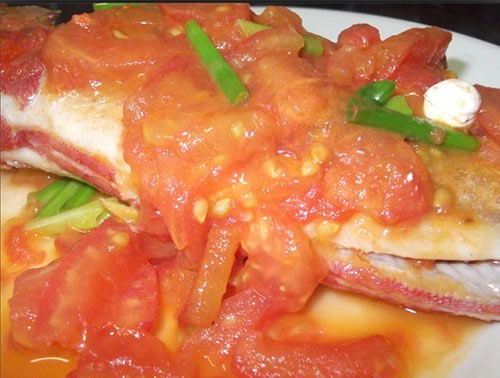及以下步骤:煎至金黄色翻转,煎另一面。 放入番茄,放适量糖,因为番茄有点酸。盖上锅盖焖煮至番茄脱青味。 撒上葱段起锅。 稍泡一会就可以轻易剥去外皮,切片。 鱼剪去边上的刺,它的刺非常坚硬,容易被刺伤,鱼皮也较粗糙去掉。 热油锅,下姜片、葱段、盐爆香。 放入大眼鸡鱼,中大火煎。 煎至金黄色翻转,煎另一面。 放入番茄,放适量糖,因为番茄有点酸。盖上锅盖焖煮至番茄脱青味。 撒上葱段起锅。