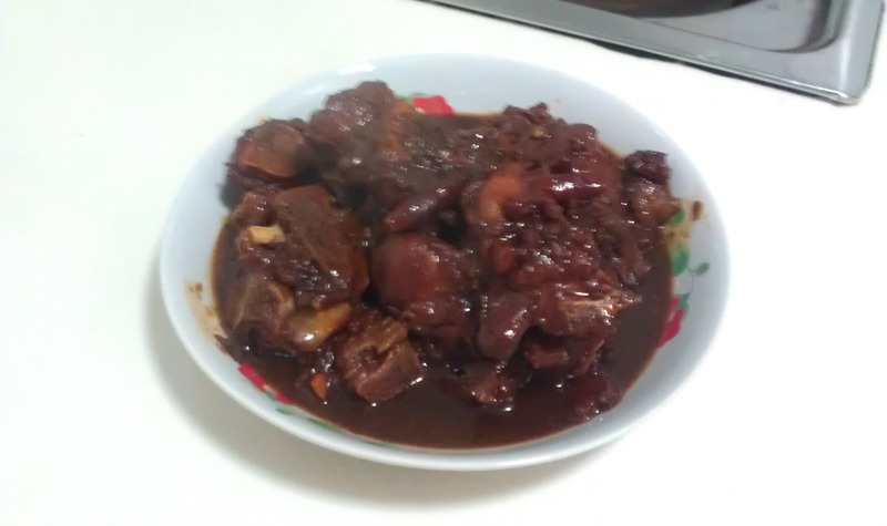4、脊骨倒进糖色锅里,大火爆炒,要炒到脊骨的表面焦焦的发黄。放进切碎的蒜碎,煸炒出香味,放进姜丝再炒一下。加进料酒,老抽,生抽,蚝油两勺,继续煸到汤汁收浓。把炒锅所以料放进已经烧开的炖锅里,勺子把顿锅的汤加进炒锅里一些,把炒锅沾的汤料涮干净倒进炖锅。大火烧开,转到中小火加盖焖半个钟头到四十分钟。出锅加香菜。香喷喷的酱脊骨就做好啦,开动。。。