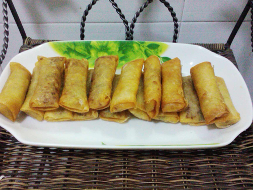 7、油锅烧至八成热,下入春卷入锅炸。