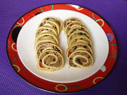 及以下步骤:取出,切片装盘,ok! 五花肉馅放入味极鲜酱油、鸡粉、盐拌匀。 木耳提前泡好,香菇洗净,春笋泡洗干净。 五花肉馅放入味极鲜酱油、鸡粉、盐拌匀。 木耳提前泡好,香菇洗净,春笋泡洗干净。 把香菇、青椒、红椒、木耳、春笋放入肉馅中拌匀。 把肉馅均匀的铺在豆皮上。 用力卷结实。 放入锅里大火15分钟(我这个太长,切开了)。 取出,切片装盘,ok!