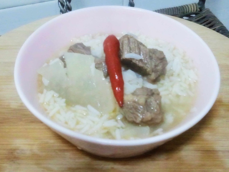 昨天煲的牛肉萝卜汤没有喝完,今天气温又降了几度,用剩下的牛肉萝卜汤煮泡饭,辣辣的、暖暖的,好吃哦!