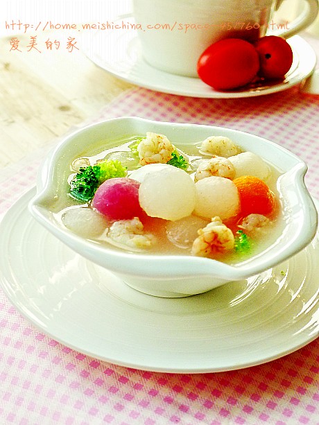 今天这道汤是女儿的功劳,那天做了萝卜鱼丸汤之后,小人儿就喜欢上了挖球器,在厨房里东挖西挖,在胡萝卜和水萝卜上也挖出不少球球,鲜艳的颜色很是让人喜欢,用它配着虾仁,鹌鹑蛋再加了二颗西兰花煮出了一个五彩的汤,小人儿抱着碗边数颜色嘴里念叨着吃了几个球球,很快一碗汤就见底了,有时候让孩子适当地走进厨房不仅可以增加不少欢乐,还多了一点点美食创意。