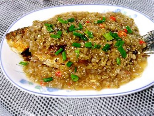及以下步骤:锅内留底油,放入小米椒粒及生姜粒炒出香味。 放入榨菜加入一茶勺白糖翻炒2分钟。 加入水淀粉烧开,小火焖煮2分钟。 倒入一勺蒸鱼鼓汁,撒入小量鸡精提味搅匀关火。 将熬煮好的榨菜汁淋在鱼身上,撒上少许葱花即可享用。 锅内留底油,放入小米椒粒及生姜粒炒出香味。 放入榨菜加入一茶勺白糖翻炒2分钟。 加入水淀粉烧开,小火焖煮2分钟。 倒入一勺蒸鱼鼓汁,撒入小量鸡精提味搅匀关火。 将熬煮好的榨菜汁淋在鱼身上,撒上少许葱花即可享用。
