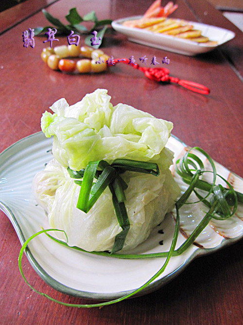及以下步骤:炒香鸡肉后,加入白菜丁一起大火快炒。 加盐调味即可关火。 去掉水份,包在已经用水烫软的白菜叶,用烫软的韭菜扎成菜包。放入蒸一至两分钟即可。 淋上用生粉生抽勾欠的薄欠即可装盘食用。 白菜梗切丁备用。 锅烧热油,划入鸡肉丁炒出香味。 炒香鸡肉后,加入白菜丁一起大火快炒。 加盐调味即可关火。 去掉水份,包在已经用水烫软的白菜叶,用烫软的韭菜扎成菜包。放入蒸一至两分钟即可。 淋上用生粉生抽勾欠的薄欠即可装盘食用。
