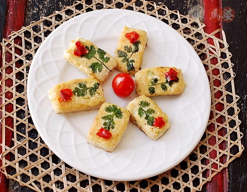 及以下步骤:豆腐泥放鸡蛋,胡椒粉,盐,淀粉。 充分搅拌,根据情况加淀粉,容易成型即可。 每块萝卜放豆腐泥,用抹刀整齐。 贴上香菜叶。 煎锅放油,热后放入带豆腐泥的萝卜块,小火煎。 轻轻翻动煎另一面。 出锅,点缀剁椒。 煎锅放油,热后放入带豆腐泥的萝卜块,小火煎。 轻轻翻动煎另一面。 出锅,点缀剁椒。