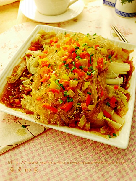及以下步骤:找一稍大的平盘,底部先铺上泡软沥干水份的粉丝用量为2/3。 再铺上白菜芯。 再撒上一层红椒粒黄椒粒胡萝卜粒,不要用完,留下1/3。 将做好的蒜香酱汁浇上,留少量的汁液。 再将余下的粉丝盖在酱汁上面,将余下的酱汁液淋在粉丝上。 上锅大火蒸10分钟。 锅中热油,将花椒爆香。 菜蒸好后再撒上余下的红椒黄椒及胡萝卜粒,撒香葱碎,将剔掉花椒的热油浇上即可食用。 锅中热油,将花椒爆香。 菜蒸好后再撒上余下的红椒黄椒及胡萝卜粒,撒香葱碎,将剔掉花椒的热油浇上即可食用。