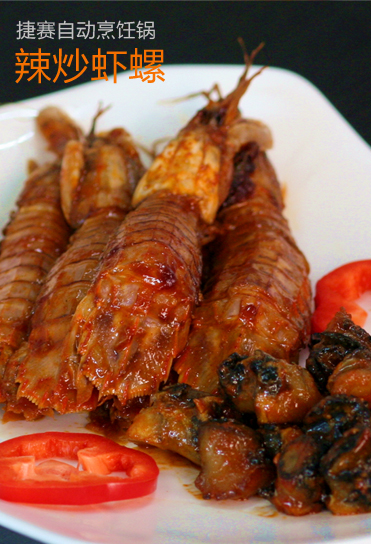 辣炒虾螺 被青岛人称之为虾虎的海味,学名叫虾蛄,一般都叫它琵琶虾或皮虾,东北叫爬虾,北京叫皮皮虾,天津,山东部分地区和大连都叫虾爬子,这种海味无论清蒸还是水煮都是很美味的,因为它既有虾的鲜美还有蟹的口感。海螺更是沿海人常食的。二者结合起来异常鲜美,微辣鲜香的口味定会让您食欲大开。 主料:虾虎250克、海螺250克 调料:葱4段、姜4片、干辣椒3个、辣椒酱30克、料酒10毫升、盐6克、油30毫升 水量:100毫升 做法: 1. 处理主料 a. 虾虎处理干净; b. 海螺洗净沥干; 2. 装锅启动 a. 锅内倒入油(30毫升),放入葱段、姜片、干辣椒; b. 放入辣椒酱、虾虎、海螺; c. 倒入料酒(10毫升)、盐(4克)以及水量(20毫升); d. 盖上锅盖,按下[干锅炒]键,启动自动烹饪程序。 3. 出锅装盘 a. 待烹饪结束时,将锅内食材搅拌均匀,盛入盘中,摆盘即可上桌。