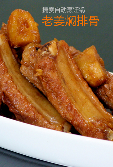 老姜焖排 姜作为香辛料以往大多被人们作为辅助调料来使用,而这道老姜焖排是将其作为主料来和排骨搭配,成品味道辛香,姜味浓厚,口感软嫩。在咀嚼之时,您会感到姜味留存于口中,口味异常独特。 主料:猪肋排450克、老姜一块(约120克) 调料:葱3段、料酒10毫升、老抽5毫升、糖10克、盐3克、油30毫升 水量:600毫升 做法: 1.处理主料 a. 猪肋排洗净入水焯烫3分钟,捞出沥干; b. 老姜去皮,洗净切小块后拍散; c. 放入姜散和料酒(10毫升)腌渍排骨; 2.装锅启动 a. 锅内倒入油(30毫升),放入葱段、姜散、猪肋排; b. 放入老抽5毫升、糖10克、盐3克以及水(含所有液体调味料共600毫升) c. 盖上锅盖,按下[排骨]键,启动自动烹饪程序。 3.出锅装盘 a. 待烹饪结束时,挑出葱、姜调味料,将锅内食材搅拌均匀盛入盘中,摆盘即可上桌。