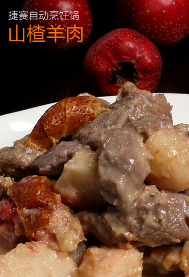 山楂羊肉 山楂,又叫山里红是入秋的标志性水果之一。作为应季水果食之兼备消食功能。但是独食山楂未免过酸也不那么可口。山东莱西的山楂以果型大而闻名,其口感绝佳,酸甜适度,风味独特。闻名遐迩的青岛海云庵糖球会就多以莱西山楂为原料。荸荠又叫马蹄,济宁汶上县的马蹄尤为著名,选购马蹄时选择尖顶较短的,口感较为爽脆;尖顶较长的,口感较为绵软。烹制本菜选择爽脆的口感为佳。捷赛选用这两种当地特产研发出这道秋季小炒,让二者与羊肉搭配,不但有解除肉腻的效果,还兼具开胃化食的功能。 主料:羊肉300克、山楂150克、生荸荠150克 调料:葱末3克、姜末3克、糖20克、盐3克、料酒10毫升 水量:800毫升 做法: 1. 处理主料 a. 山楂去籽切小块; b. 荸荠去皮,对半切开; c. 羊肉切大块,加料酒(10毫升)、盐腌制20分钟以上; 2. 装锅启动 a. 锅中放油(20毫升),放入葱3段、姜4片; b. 放入羊肉块、荸荠块、山楂块; c. 放入糖、料酒(10毫升)、盐、水淀粉(10毫升)以及水(包含所有液体调味料共800毫升); d. 盖上锅盖,按下[五花肉]键,启动自动烹饪程序。 3.出锅装盘 a. 待烹饪结束时,将锅内食材搅拌均匀盛入盘中,摆盘即可上桌。