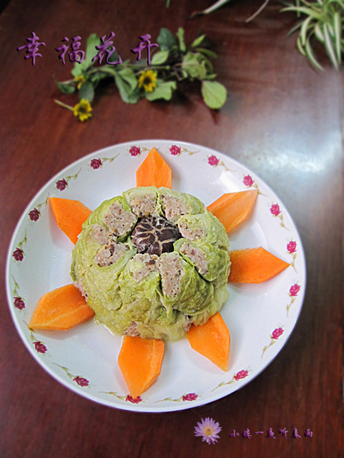 幸福,是每人都追求的!而每个人的幸福要求也不同,有的人一粥一饭,和心爱的人在一起共尝,亦觉得是幸福。有的人的追求就会高点,希望有属于自己的房子,最好是大点,或是孩子学业有成,或是事业有成,手上有多点的余钱,或是可以和心爱的人一起环游世界各地,总之各人的幸福感各不相同,但每个人都是在追求幸福!我希望每个人的幸福之花会来临,每个人都要幸福快乐! 这道菜,也是我妈妈逢年过节的时候必做的菜。从小就喜欢吃,特别是鲜肉配上香菇和虾米剁碎,用白菜叶卷好切段,放碗里蒸得绵软香甜,吃饭也会吃得多点。在粤语里,叫小孩子叫做苏虾(音译哈)所以这菜在喜宴也会上的,因为里面包有虾米,所以寓意早日生子的意思哈。 白菜具有养胃通便,利水除烦的功效,可用于口干烦渴,大小便不利,肺热咳嗽等。因白菜含纤维较多,不仅可以促进肠蠕动,帮助消化,防止大便干燥,而且可以用来防治结肠癌。经常吃白菜可防止维生素c缺乏症(坏血病)。白菜丰富的纤维和维生素c,可以补足冬天蔬果摄取的不足,中医药理偏寒性的白菜,也可以平衡体内的燥热之火。
